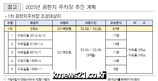 토지주의 신청을 받아 상반기 공한지 주차장 조성을 1차적으로 추진하고 있는 지역은 5개소(아라동 3개소, 이도동 2개소)로, 61면의 주차 면수 조성을 목표로 하고 있다.