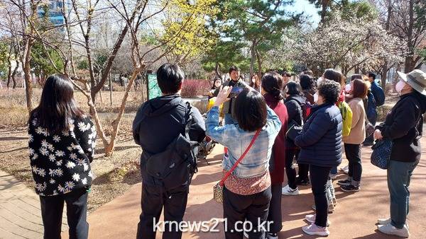 ▲ 사진=‘정원사 양성 과정’ 참여자들이 장안근린공원 내 녹지를 둘러보고 있다.동대문구(구청장 이필형)가 구민과 함께 가꾸는 ‘꽃의 도시’를 조성하기 위해 주민을 대상으로 정원사 양성에 나섰다.