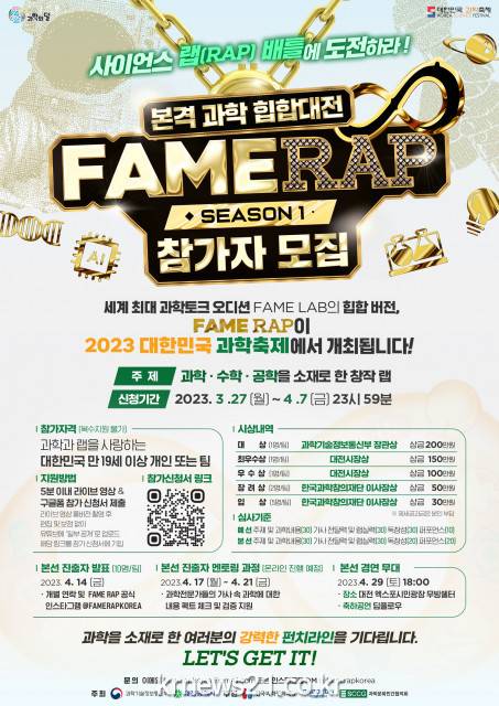 ▲ 사진=과학문화민간협의회2023 대한민국 과학축제에서 과학 래퍼 발굴 오디션 ‘페임랩(Fame RAP) 시즌1’이 개최된다. 페임랩(Fame RAP)은 세계 최대 과학 토크 오디션 ‘페임랩(Fame Lab)’의 힙합 버전 대회로 과학을 소재로 한 다양한 주제의 창작 랩 지원을 받고 있다.