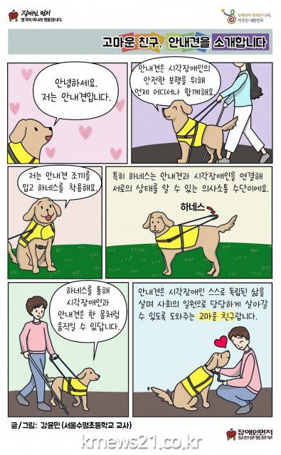 이번 웹툰은 △고마운 친구, 안내견을 소개합니다(강윤민 교사) △안내견은 어디든 함께 갈 수 있어요!(강지현 교사) △눈과 마음으로 인사해주세요(허혜숙 교사) △사진은 반드시 물어보고 찍어주세요(정다운 교사) △안내견을 위한 선물(임소정 교사) 총 5편으로, 안내견을 만났을 때 지켜야 할 내용을 쉽게 담아냈다.