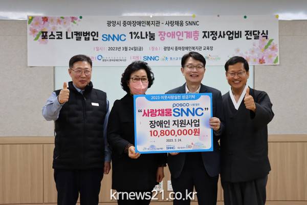 이날 지정사업비 전달식에는 광양시 중마장애인복지관 정헌주 관장, SNNC 두진홍 경영지원실장, 광양시 사랑나눔복지재단 장충세 사무처장, 한국여성소비자연합 광양시지부 조서윤 회장 외 SNNC 가득찬만남 봉사단이 참석했다.