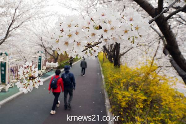 ▲ 사진=동대문구 장안벚꽃길에 벚꽃이 만개해 주민 발길이 이어지고 있다.따뜻한 봄바람에 동대문구(구청장 이필형) ‘장안벚꽃길’이 분홍빛 벚꽃으로 물들었다. 벚꽃은 이번 주말 절정을 이룰 전망이다.