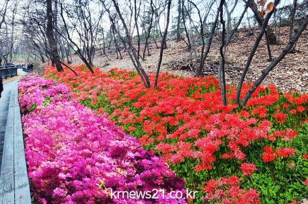 ▲ 사진=둘레길 사면 꽃무릇 식재 예상 이미지 꽃의 도시 동대문구(구청장 이필형)가 ‘서울형 치유의 숲길’로 지정돼 구민의 사랑을 받고 있는 배봉산근린공원의 대대적인 정비에 나선다.