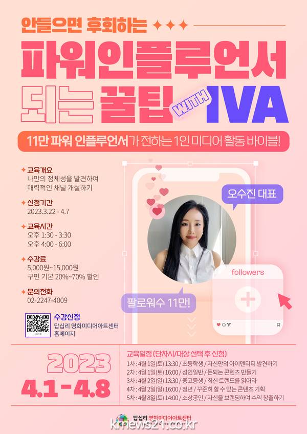 답십리영화미디어아트센터 관계자는 “1인 미디어에 대한 관심이 높아지고 인플루언서들의 영향력이 커지고 있어 11만 팔로워를 보유한 인플루언서를 강사로 한 특강을 마련했다”며, “각 대상별로 맞춤형 강의를 진행할 예정이니, 관심 있는 분들의 많은 참여를 부탁드린다”고 밝혔다.