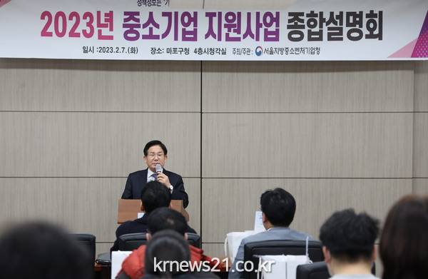 ▲ 사진=2023 중소기업 지원사업 종합설명회에 참석한 박강수 마포구청장마포구(구청장 박강수)가 신규 채용 여력이 없는 소상공인의 인건비 부담을 덜고 근로자 고용을 유지할 수 있도록 돕는 서울시 ‘소상공인 버팀목 고용장려금’과 ‘무급휴직 근로자 고용유지지원금’을 오는 3일부터 접수한다.