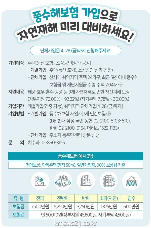 구로구 관계자는 “풍수해보험이 예상치 못한 기상 이변을 대비하는 데 도움이 될 것”이라며 “가입 이후 발생한 자연재해에 대해 보상하므로 우기 전 가입해주시길 당부드린다”고 전했다.