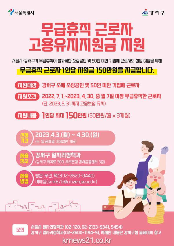 대상은 강서구 소재 소상공인 및 50인 미만 기업체의 근로자 중 지난해 7월 1일부터 올해 4월 30일까지 월 7일 이상 무급휴직을 실시하고, 오는 5월 31일까지 고용보험을 유지한 근로자이다. 오는 6월 초에 1인당 월 50만 원씩 최대 3개월간 총 150만 원을 지급한다.