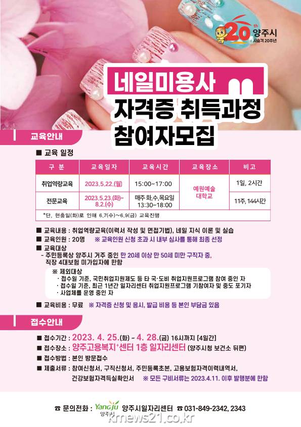 ▲ 양주시, 2023년 네일미용사 자격증 취득 참여자 모집양주시일자리센터에서는 오는 25일부터 28일까지 2023년 취업지원프로그램 ‘네일미용사 자격증 취득과정’에 참여할 교육생을 모집한다.