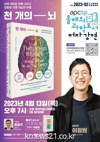 이번 2회차 강연은 4월 13일(목) 오후 7시에 제프 호킨스의 저서 ‘천 개의 뇌’를 대상으로 포항 체인지업그라운드 2층 미디어월[2]에서 이정원 페블러스(Pebblous) 부대표가 전문가로 나서 진행한다. 강연 후 저자와 청중들이 자유롭게 이야기를 나눌 수 있는 세션도 마련됐으며, 참가자에게는 ‘천 개의 뇌’ 도서를 선물로 증정할 계획이다.