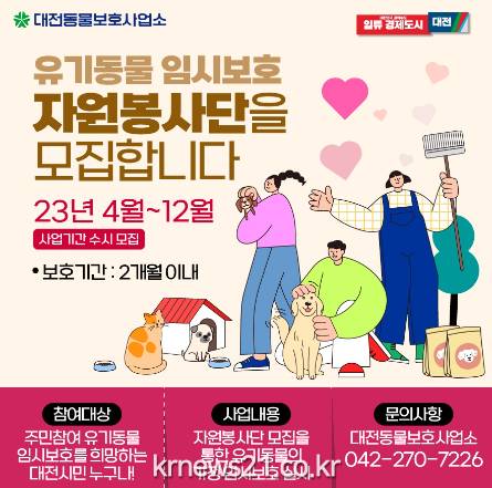 임건묵 대전동물보호사업소장은 “이번 임시보호 자원봉사단 운영을 통해 보호 동물 생명의 존엄성과 소중함, 인간과 동물의 공존을 다시 한번 생각해 보는 계기가 될 것으로 기대한다”며, “자원봉사단 활동에 동물을 사랑하는 많은 시민들의 참여와 관심을 바란다”고 말했다.