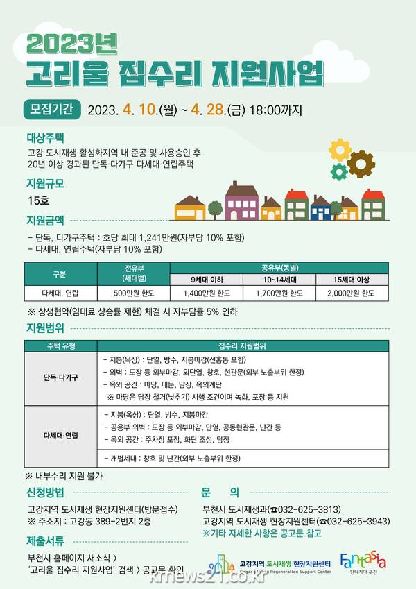 부천시(시장 조용익)는 고강지역 도시재생 뉴딜사업의 일환으로 추진 중인 고리울 집수리 지원사업의 신청자를 모집한다고 밝혔다.