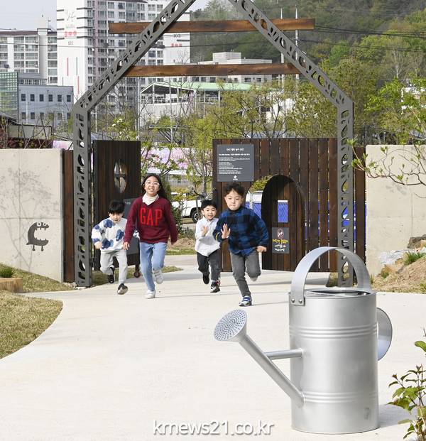 ‘KAC 열린 놀이공간-거인의 정원’은 영국 작가 오스카 와일드의 동화 ‘거인의 정원’을 모티브로 삼아 정원에 다양한 식물을 식재해 아이들이 마음껏 만져 보고 향기를 맡아볼 수 있도록 하고 구르기 잔디언덕, 통나무 탐방길, 거대한 바위언덕과 징검돌 등으로 자연에서 뛰어놀며 직접 체험하는 놀이터를 구성해 동화 속 정원을 실제로 구현했다.
