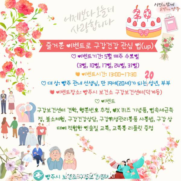▲ 양주시보건소 구강보건센터, 성년, 부부, 선생님을 위한 구강 건강 이벤트 실시양주시보건소(소장 이재환) 구강보건센터는 사랑과 감사의 달 5월을 맞아 소중한 사람들을 위한 구강 건강 이벤트를 진행한다.