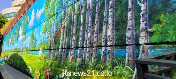▲ 사진=완성된 동대문구 천장산 숲길 벽화 동대문구(구청장 이필형)가 ‘천장산’을 찾은 주민들에게 보다 더 아름다운 보행환경을 제공하고자 등산로 옆 삭막하게 자리 잡고 있던 2개의 옹벽에 나무, 시냇물, 숲 등 자연풍경을 담은 벽화조성을 완료했다.