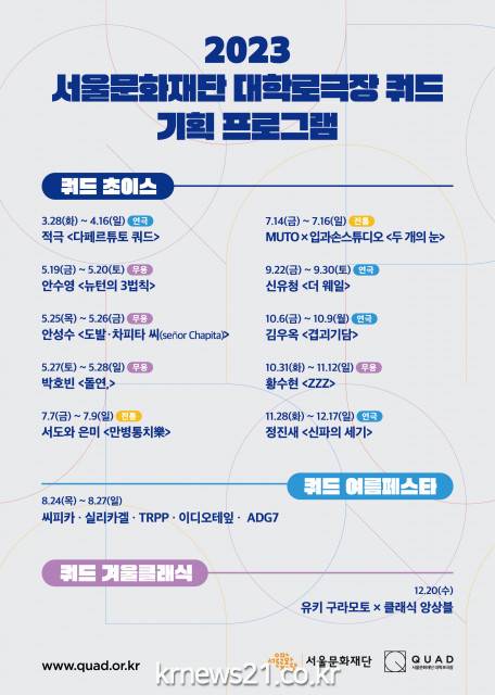 대학로극장 쿼드는 지난달 28일 ‘쿼드초이스’ 시리즈의 시작을 알린 ‘다페르튜토 쿼드’를 무대에 올린 데 이어 올해 신작 6편과 화제작 레퍼토리 3편을 추가로 선보인다. 또한 여름과 겨울 시즌을 만끽할 수 있는 ‘쿼드페스티벌’ 2회 등 연간 총 12개의 공연을 선보인다.