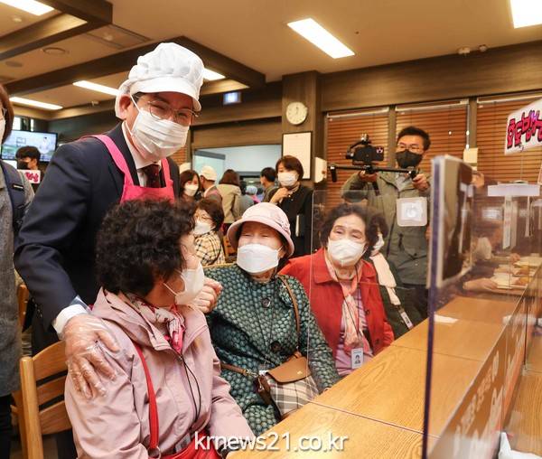 ▲ 사진=박강수 마포구청장이 24일부터 시범운영되는 주민참여 효도밥상 서강동 1호점을 방문해 지역 어르신들과 인사를 나누고 있다.마포구(구청장 박강수)가 24일 서강동 1호점부터 공덕동 1호점까지 총 7개의 주민참여 효도밥상 운영기관을 개소하고 효도밥상을 제공했다고 밝혔다.