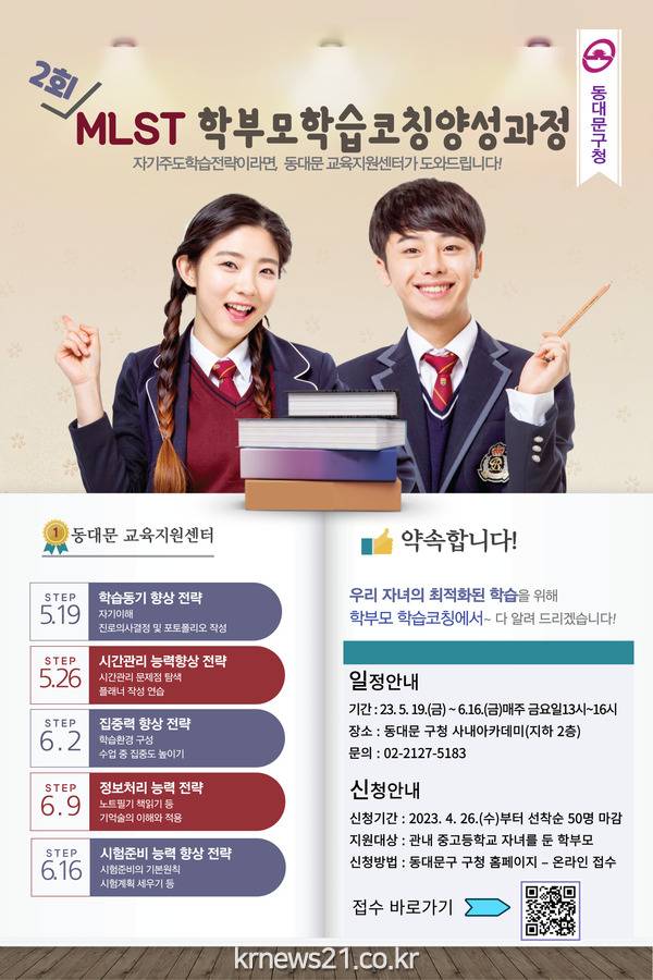 ▲ 사진=MLST 학부모 학습코칭 양성과정 2기 홍보 포스터동대문구(구청장 이필형)가 ‘MLST 학부모 학습코칭 양성과정 1기’의 뜨거운 호응에 힘입어 올해도 관내 중·고등학생 자녀를 둔 학부모를 대상으로 ‘MLST 학부모 학습코칭 양성과정 2기’를 무료 운영한다.
