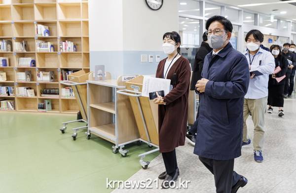 ▲ 사진=마포중앙도서관을 둘러보는 박강수 마포구청장마포구(구청장 박강수)가 구립도서관 운영 활성화와 독서지원 서비스 강화에 중점을 두고, 전년 대비 도서관 운영에 드는 전체 예산을 늘리는 등 도서관 서비스의 질을 높이는 데 힘쓰고 있다.