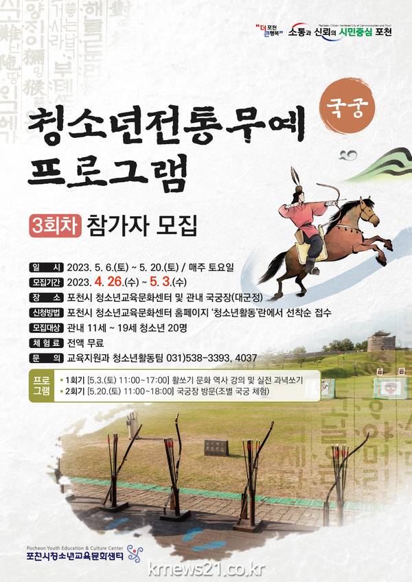 ○ 제공부서: 교육지원과 청소년활동팀 황효인 ☎ 031)538-3393, 3394 ○ 사진있음: 포천시 청소년교육문화센터, 청소년 전통무예(국궁) 포천화랑 프로그램 3회차 참가자 모집