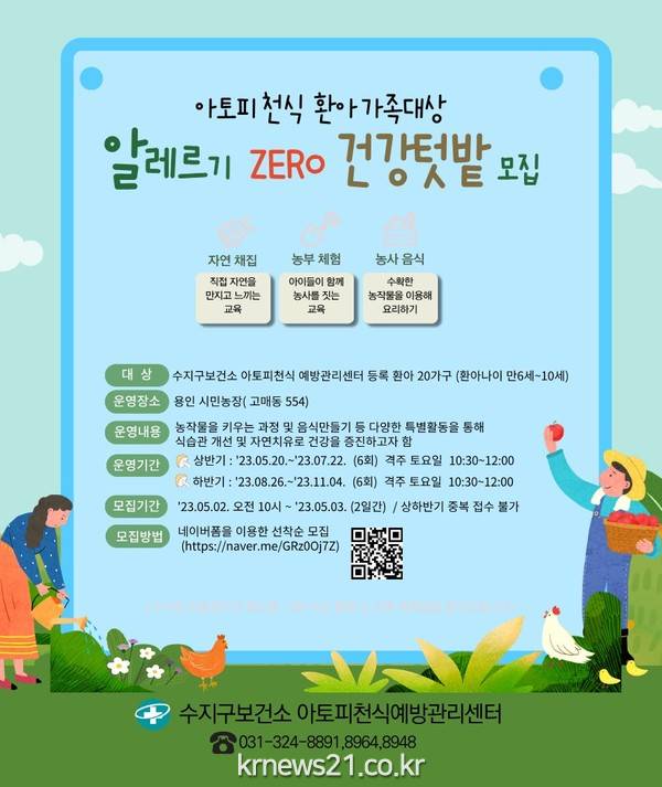 ▲ 사진=‘알레르기 제로 건강 텃밭’ 프로그램 참가자 모집 홍보 포스터용인특례시 아토피·천식 예방관리센터는 텃밭을 가꾸며 알레르기 질환을 개선할 ‘알레르기 ZERO 건강 텃밭’ 프로그램 참가자를 선착순 모집한다고 28일 밝혔다.