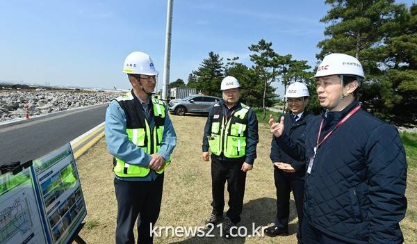 2. 28일, 김포국제공항에서 윤형중 한국공항공사 사장(오른쪽)이 이동지역 포장공사 현장을 점검하고 있다.