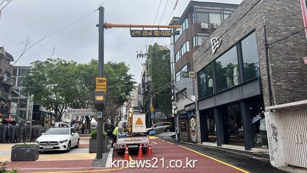 ▲ 사진=홍대 레드로드(어울마당로 51)에 설치한 불법 주정차 무인 단속카메라. 구는 5월 1일부터 운영시간을 심야 및 일요일, 공휴일까지로도 확대해 연중 24시간 단속한다.마포구(구청장 박강수)가 인파 밀집지역인 홍대 일대의 보행 안전과 원활한 교통 소통을 위해 이달 1일부터 불법 주정차 무인 단속카메라를 연중 24시간 운영한다.
