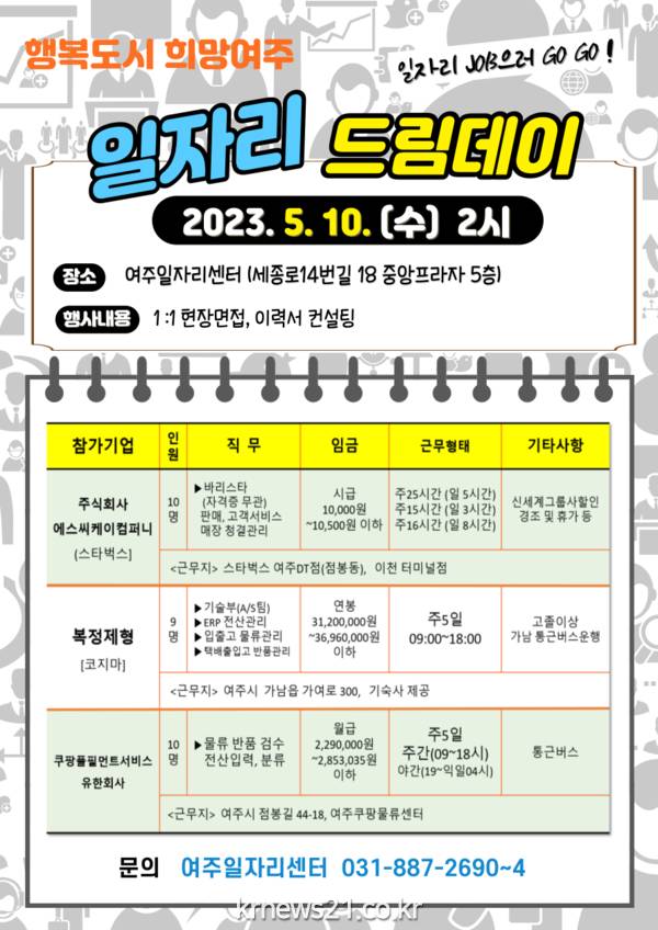이번 일자리드림데이 구인업체는 총 3곳으로 SCK컴퍼니에서는 스타벅스 여주DT점 등에서 근무할 바리스타 10명, 가남읍 소재의 코지마에서는 기술부·전산·물류·반품관리분야 등 9명, 여주쿠팡물류센터에서 물품반품검수·전산입력분야 등 10명을 모집할 예정이다.
