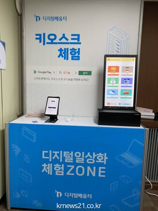 ‘키오스크’는 터치스크린 방식의 무인정보 단말기로, 정부기관, 은행, 백화점, 마트 등 점점 확대되어 보편화되었지만, 어르신들에겐 다소 생소해, 주변의 도움 없이는 키오스크에 다가가는 것 자체를 낯설어 하고 있다. 이에 디지털배움터 교육장 앞에 ‘체험존’을 설치해 누구든 키오스크에 접근할 수 있는 기회를 제공한다.