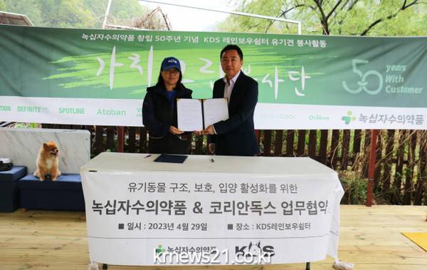 녹십자수의약품은 이날 코리안독스와의 업무협약(MOU)을 마친 후 사단법인 코리안독스가 운영하는 유기견 보호소 레인보우 쉼터에서 동물용 의약품 지원과 봉사활동도 함께 진행했다.