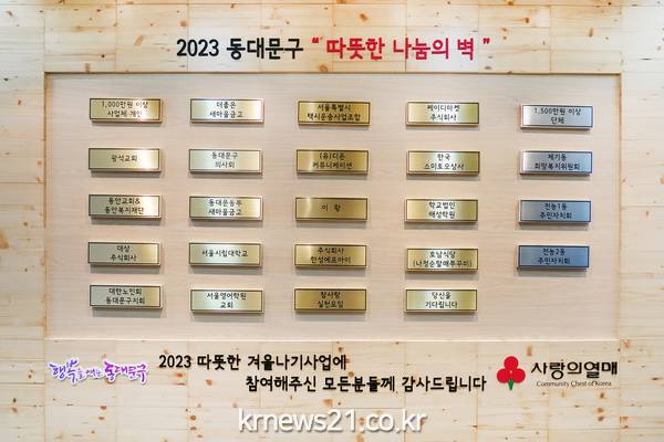 올해 ‘따뜻한 나눔의 벽’에는 1,000만 원 이상을 기탁한 사업체·개인과 1,500만 원 이상을 기탁한 단체의 이름을 새겼다. 올해 우수기부자로 선정된 개인·기관·단체는 광석교회, 동안교회&동안복지재단, 대상주식회사, 대한노인회동대문구지회, 더좋은새마을금고, 동대문구의사회, 동대문동부새마을금고, 서울시립대학교, 서울영어학원교회, 서울특별시택시운송사업조합, (유)디온커뮤니케이션, 이황(개인), 주식회사한성에프아이, 참사랑실천모임, 케이디마켓주식회사, 한국스미토모상사, 학교법인해성학원, 호남식당(나정순할매쭈꾸미), 제기동 희망복지위원회, 전농1동 주민자치회, 전농2동 주민자치회다.