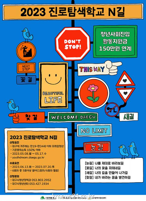 ▲ 사진=대전광역시대구광역시와 대구광역시청년센터는 청년이 자신의 길을 선택하는 데 도움이 될 수 있도록 진로탐색의 기회를 제공하는 ‘진로탐색학교 N길’에 참여할 청년들을 5월 8일(월)부터 17일(수)까지 모집한다.