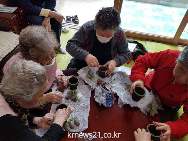 거동이 어려운 어르신을 대상으로 동주민센터 방문간호사가 건강관리와 건강상담을 진행했다. 어르신들의 건강하고 행복한 노후생활을 위해 커피박 화분을 활용한 식물 키우기 프로그램을 진행했다.