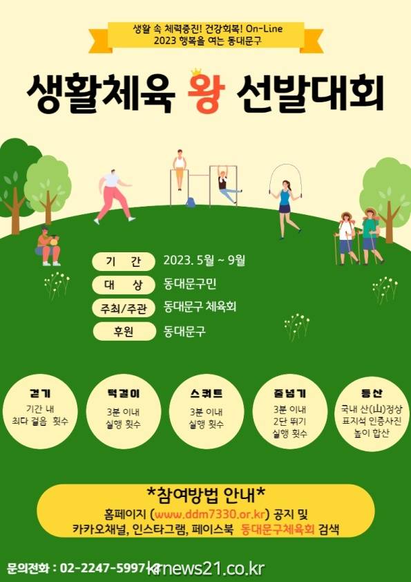 ▲ 사진=‘2023년 생활체육왕 선발대회’ 홍보 포스터동대문구(구청장 이필형)가 주민의 체력회복과 건강증진을 위해 ‘2023년 생활체육왕’을 선발한다.