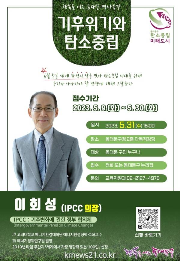 ▲ 사진=5월 행복을 여는 동대문 명사특강 홍보 포스터동대문구(구청장 이필형)가 오는 31일 이회성 IPCC(Intergovernmental Panel on Climate Change, 기후변화에 관한 정부 간 협의체) 의장을 초청해 ‘기후위기와 탄소중립’을 주제로 특강을 진행한다.