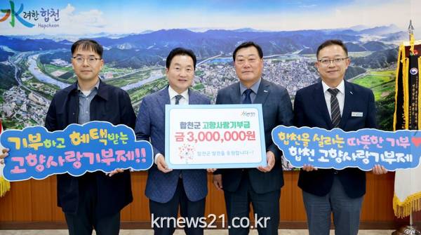 지현철 대표이사는 “고향사랑기부제 참여로 고향인 합천군 발전에 도움이 된 것 같아 기쁘다”며 “다른 출향인분들도 합천군 고향사랑기부제에 많이 관심을 갖고 동참하여 고향사랑을 이어나가기를 바란다”고 말했다.