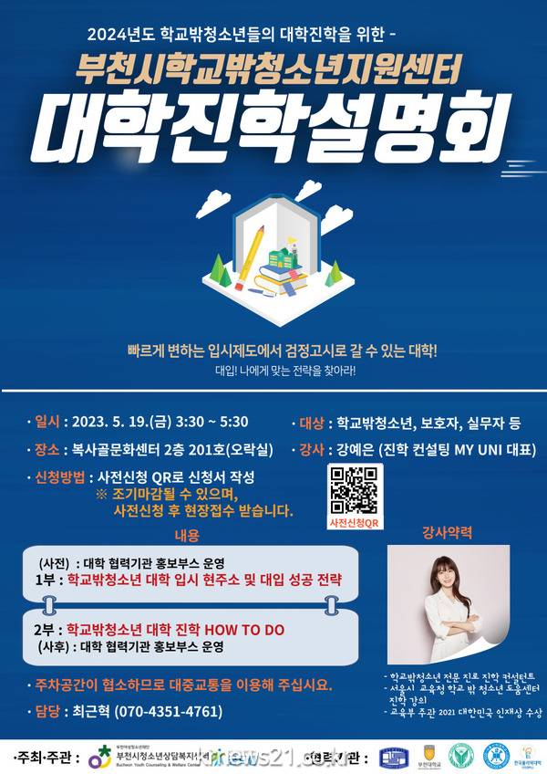□ 부천여성청소년재단(대표 양선희)는 오는 5월 19일(금), 부천시학교밖 청소년지원센터(센터장 백진현)에서 학교 밖 청소년의 입시를 돕기 위 한 『2024년 대학진학 설명회』를 개최할 예정이라고 전했다.
