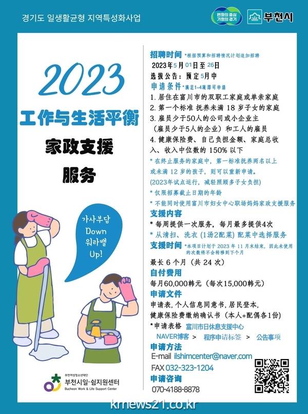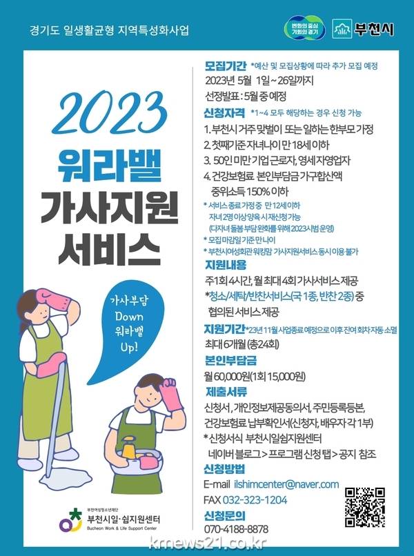□ 부천시 일·쉼지원센터(운영법인:부천시여성청소년재단)는 경기도 일생활균형 지역특성화 사업의 일환으로 ‘워라밸 가사지원서비스’를 운영하고 있다.