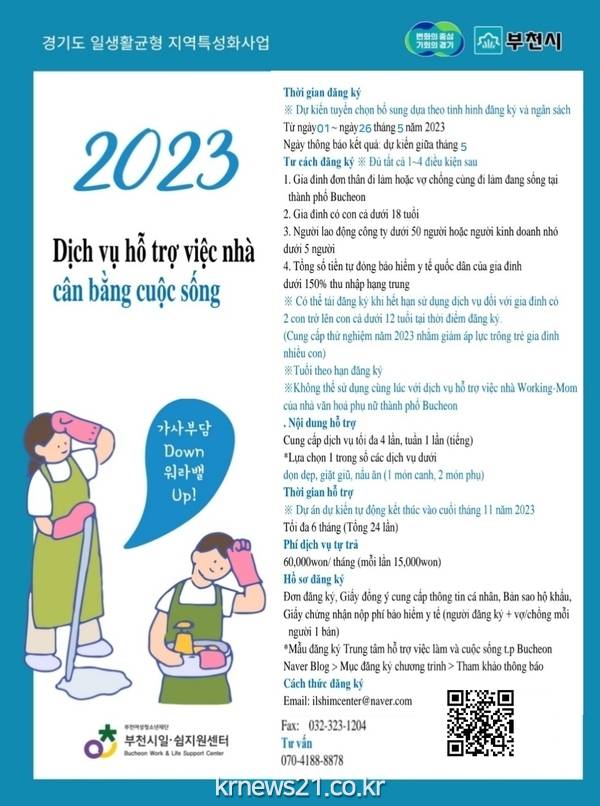 □ 한편, 부천시 일·쉼지원센터는 일하는 다문화 가정의 일생활균형지원을 위해 부천시여성회관, 부천시이주민지원센터와 함께 베트남어, 중국어, 영어 등 3개 국어 홍보물을 제작했다. 부천시 일·쉼지원센터는 부천시이주민지원센터, 부천다문화가족지원센터와 함께 일하는 다문화 가정을 위해 워라밸 가사지원서비스를 홍보할 예정이다.