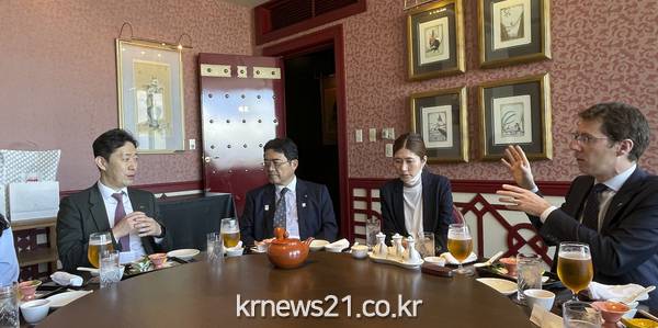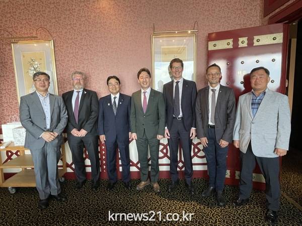 (사진설명) 15일, 일본 오사카 호텔 니코 간사이공항에서 윤형중 한국공항공사 사장(왼쪽부터 1번째)이 야마야 요시유키 간사이 공항그룹 대표(왼쪽부터 2번째), 브노와 흘로 공동대표(왼쪽부터 4번째)와 UAM 상용화를 위해 서로 협력할 것을 논의하고 있다.