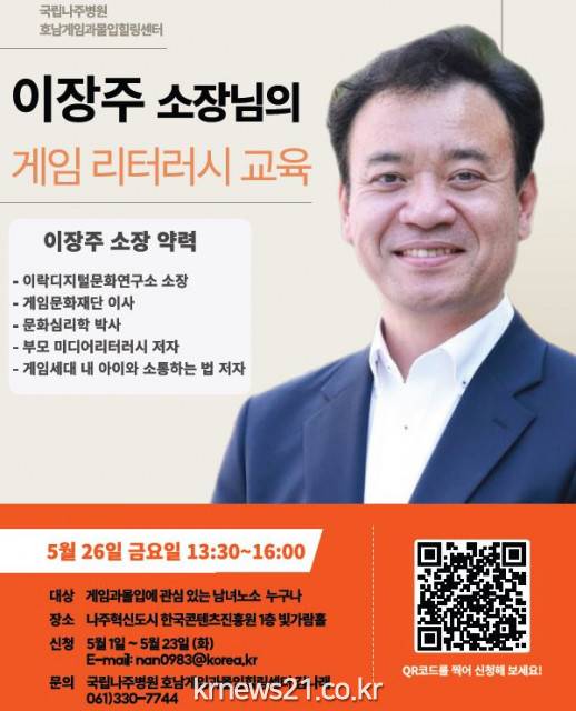 ▲ 사진=국립나주병원국립나주병원(원장 윤보현)은 5월 26일(금) 오후 13시 30분부터 16시까지 한국콘텐츠진흥원에서 ‘게임 리터러시[1] 부모교육’을 실시한다고 밝혔다.