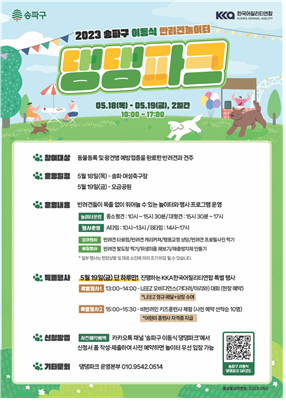 ▲ “댕댕파크로 모여라” 송파구, 18~19일 이동식 반려견 놀이터 개장송파구(구청장 서강석)는 반려인과 반려견이 자유롭게 교감하고 마음껏 뛰어놀 수 있도록 오는 18~19일 양일간, 송파 여성축구장(목) 및 오금공원(금)에 찾아가는 반려동물 이동식 놀이터인 ‘댕댕파크’를 개장한다고 밝혔다.