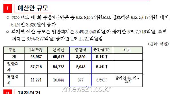 이번 추경예산은 일반회계 2,943억 원, 특별회계 377억 원을 증액했으며, 2023년 총예산은 본예산 대비 5.1% 증가한 6조 8,937억 원 규모이다.