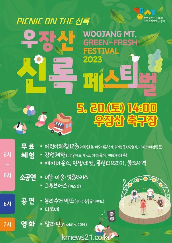 서울 강서구(구청장 김태우)는 ‘아이·소풍’을 주제로 오는 20일 오후 2시부터 밤 9시까지 우장산 축구장에서 ‘2023년 우장산 신록 페스티벌’을 개최, 문화와 예술이 넘치는 강서의 매력을 뽐낸다.