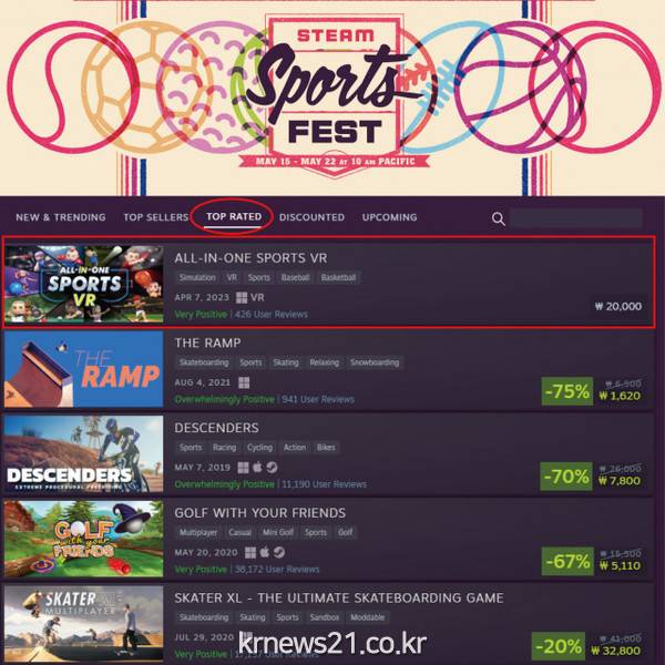 ▲ 사진=앱노리앱노리는 자사가 서비스하는 ‘올인원 스포츠 VR’ 게임이 5월 15일부터 22일(현지시간)까지 진행되는 ‘스팀 스포츠 페스트(Steam Sports Fest)’에 참가해 행사 마지막 날인 5월 22일 현재 전체 스포츠 게임 중 Top Rated 부분 1위, Top Sellers 6위를 기록했다고 밝혔다. 특히 VR 카테고리에서는 3개 부문에서 글로벌 1위를 기록했다.