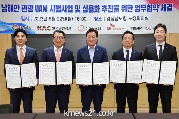 한국공항공사·한화시스템·SK텔레콤·티맵모빌리티가 참여하는 ‘K-UAM 드림팀’컨소시엄은 22일, 경상남도와 남해안 관광 UAM 사업 추진을 위한 업무협약을 체결했다.