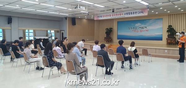 ▲ 동두천시·동두천소방서 소방합동훈련 실시동두천시와 동두천소방서는 지난 22일 동두천시청 공무원 자위소방대 20명, 동두천소방서 소방대원 11명이 참석한 가운데 소방합동 교육 및 시설점검을 실시했다.