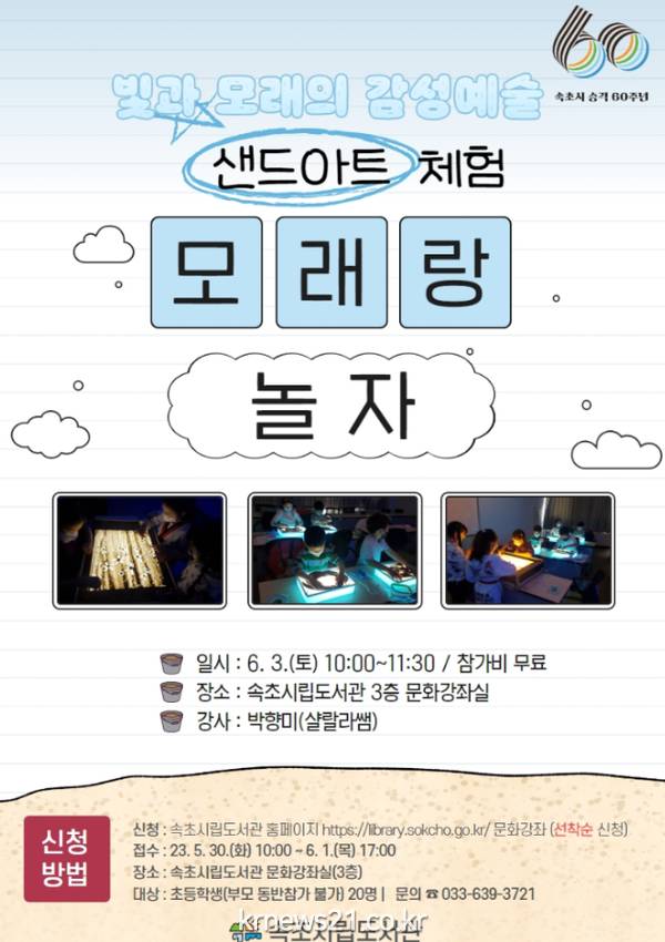 첫 번째 프로그램인 「모래랑 놀자」는 6월 3일(토) 10시 시립도서관 문화강좌실에서 운영되며, 모집대상은 초등학생(부모동반 참가 불가) 20명으로 신청은 속초시립도서관 홈페이지를 통해 5월 30일(화) 오전 10시부터 6월 1일(목) 17시까지 온라인으로 선착순으로 받는다.