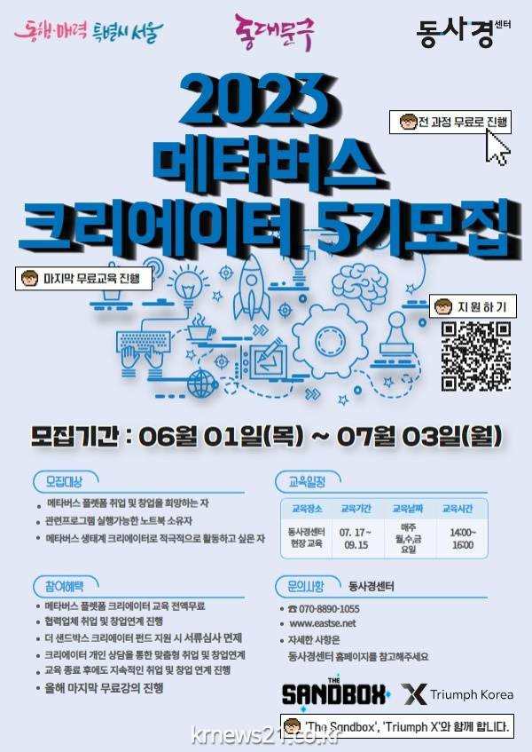 ▲ 사진=2023 메타버스 크리에이터 5기 모집 홍보 포스터동대문구(구청장 이필형)가 6월 1일부터 7월 3일까지 ‘메타버스 크리에어티 5기’ 참여자를 모집한다.