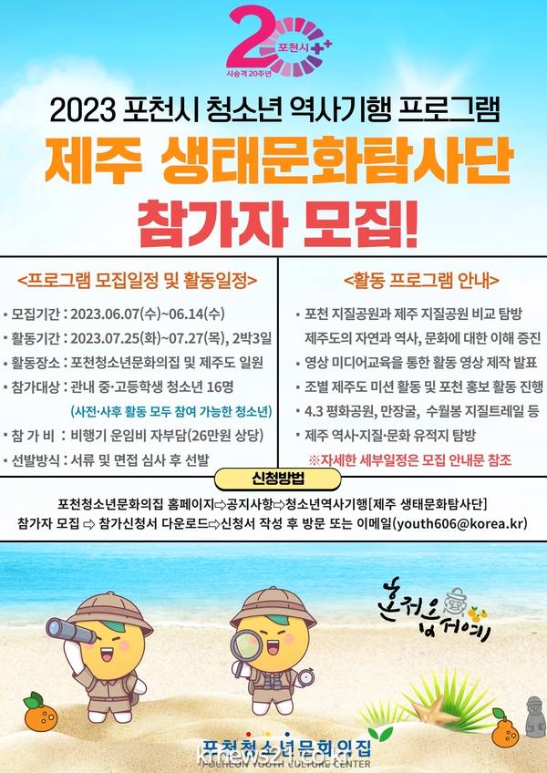 교육지원과 관계자는 “이번 사업을 통해 관내 청소년들이 쉽게 접하기 힘들었던 제주도 생태문화탐방을 통해 과거와 현재의 관계성, 지식 등을 함양하게 된다면 자연을 통해 깨달음을 얻고 미래를 바라볼 수 있는 지혜를 얻게 될 것”이라며 “앞으로도 포천시 청소년들이 다양한 체험활동을 통해 건강하게 성장할 수 있도록 적극적으로 지원하겠다”고 말했다.