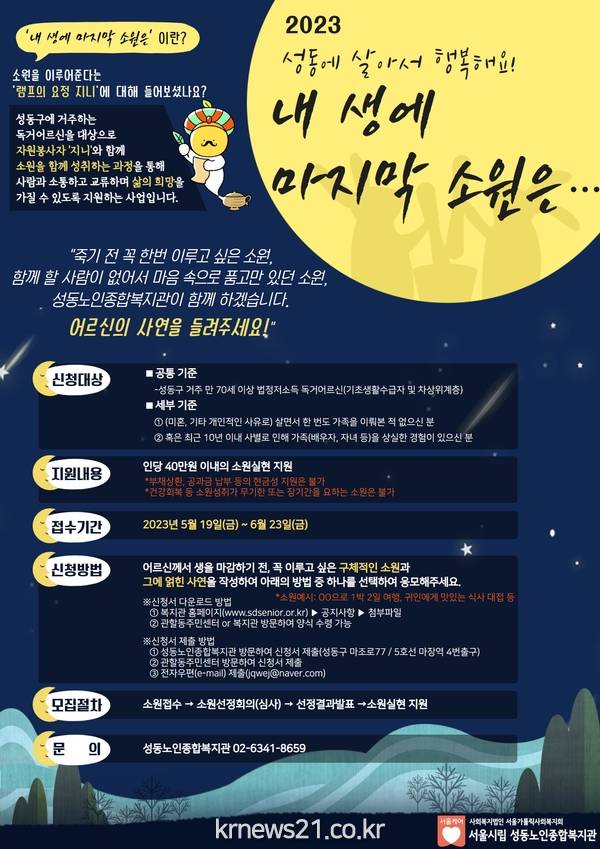 이달 23일까지 생을 마감하기 전 꼭 이루고 싶은 구체적인 소원과 그에 얽힌 사연을 신청서에 담아 동 주민센터 또는 성동노인종합복지관에 접수하면 된다. 현금성 지원이나 소원성취에 상당한 기간이 걸리는 소원 등 실현 불가능 사연은 제외된다.